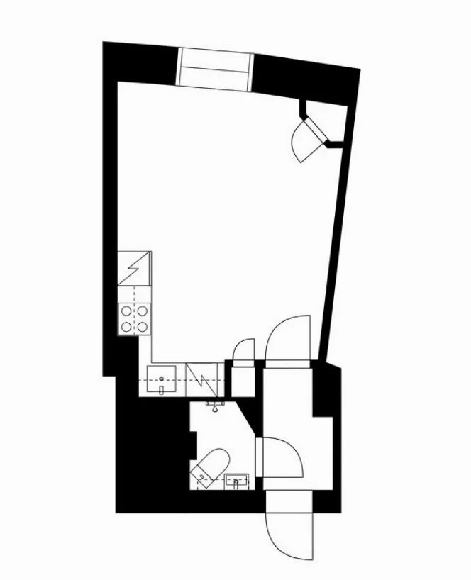 Asunnossa on tehokkaasti käytetty tila, selkeä oleskelualue, johon mahtuu hyvin sekä sänky että pieni ruokailuryhmä. Keittotila on kompakti mutta käytännöllinen.