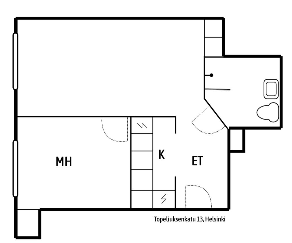 Asunto sijaitsee puiston laidalla, lähellä merenrantaa ja Töölöntorin palveluita. Hyvien kulkuyhteyksien varrella. Asunnon pohjaratkaisu on toimiva. Tilava eteinen, jonka vieressä keittokomero. Eteisestä käynti kylpyhuoneeseen sekä valoisaan olohuoneeseen. Kylpyhuone on tilava ja sinne mahtuu hyvin pesukone. Olohuoneen vieressä erillinen makuuhuone.